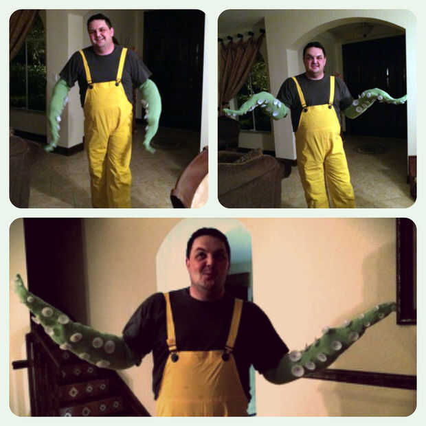 Este es un disfraz que me puse con mi hija de 7 meses en un baby-bjorn. El concepto era un pulpo con sacudiendo tentáculos atacando a un buceador. Yo trabajaba con un presupuesto cero en mente, aunque acaban de comprar el equipo de snorkel. Todos los