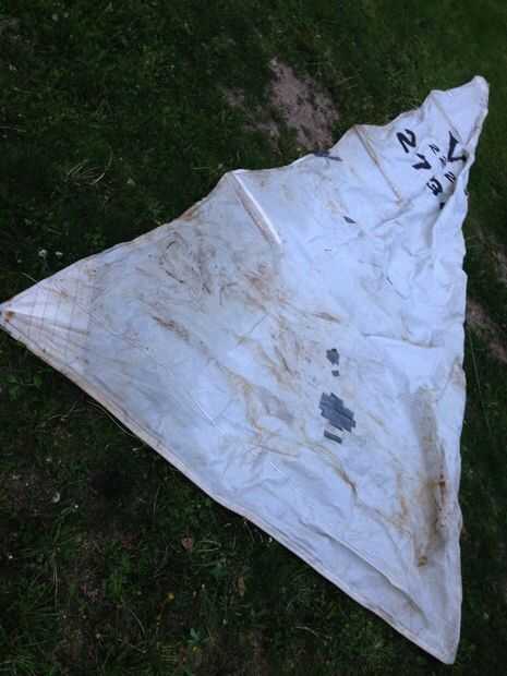 La vela que hemos tenido por parte fue descartada de un barco después de que fue almacenado con ratones uno de invierno. Reparaciones se habían intentadas con cinta adhesiva, que debían eliminarse junto con los números cosidos. Utilizando a un descosedor, las puntadas fueron acortadas y eliminar el desorden. También retirado fueron los listones que mantienen el borde de la vela rígida, cortando en el extremo de la carcasa y deslizándolos hacia fuera. Las carcasas se pueden dejar en su lugar.