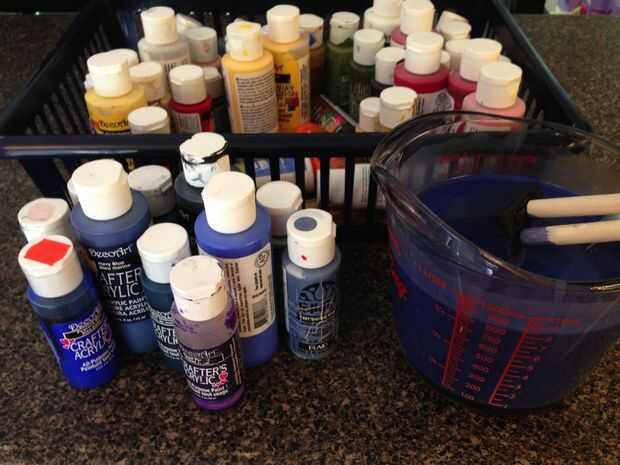 Pintura en vela lona es posible con la pintura del arte de acrílico, con algunas alteraciones. La pintura directamente de la botella es demasiado gruesa y se agrietará cuando esté seco. La solución es diluir la pintura. No hay ninguna cantidad mágica, pero hemos encontrado pintura de 1/3 y 2/3 agua para ser ideal. Mezcle una solución de al menos 4 tazas de pintura diluida. Diviértete con mezcla de color para conseguir que el color ideal. En este caso, se utilizan botellas de parte de la pintura sólo utilizarlos para arriba y combinan para obtener un color azul. Pintura de acrílico del arte tiende a grupo en la parte inferior, y agitando la botella con agua era una buena oportunidad para usar restos y dispersar los grumos.