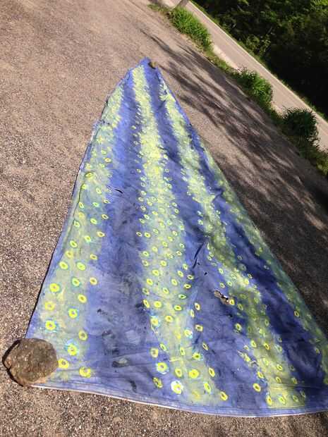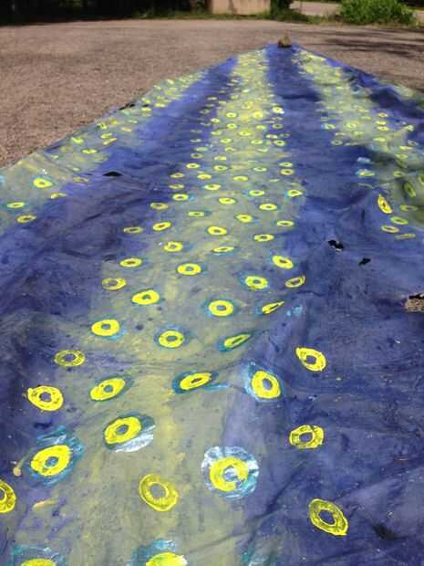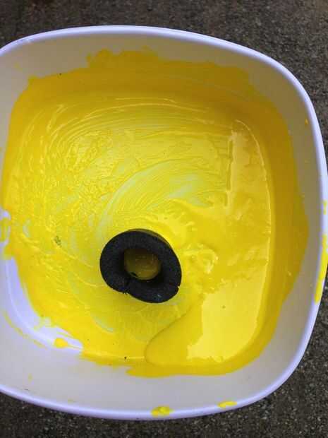 Repetir el método en el último paso, esta vez con amarillo y utilizando una rebanada de aislamiento de la pipa en vez de un tallarín de piscina. Marcar el círculo amarillo más pequeño dentro del color base azul. Crean las ventosas más grandes. Añadir sellos adicionales amarillo a lo largo del borde del cúmulo de ventosas, para crear pequeñas ventosas.