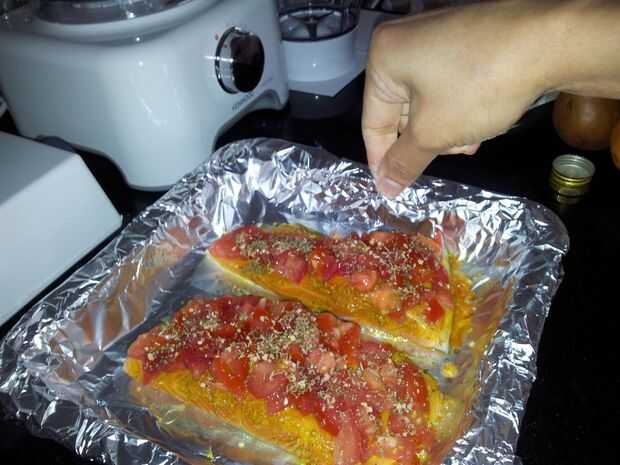 Tentadora al horno comida Salmon - tomate baby y hierba en costra al horno de salmón con arroz y espárragos asados (12 / 18 paso)