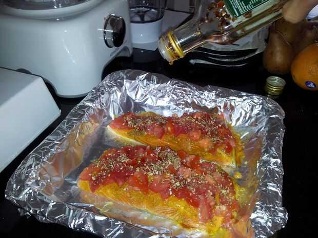 Tentadora al horno comida Salmon - tomate baby y hierba en costra al horno de salmón con arroz y espárragos asados (13 / 18 paso)
