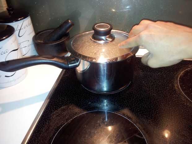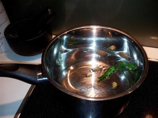 Para cocinar el arroz, calentar una sartén de fondo pesada y verter 2 cucharaditas de aceite. Agregar el chile verde, la canela y el cardamomo.