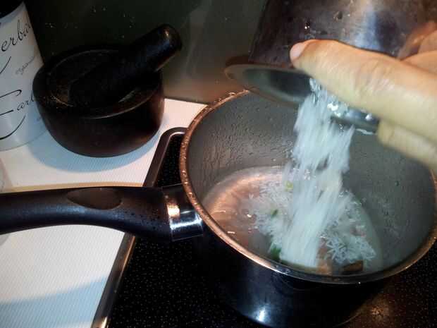Inmediatamente, añadir el arroz, agua, sal y pimienta. Cubra y lleve a ebullición. Cuando arranque el hervor, reduzca el fuego a bajo y cocinar por 10 minutos.