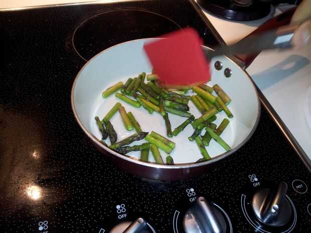 Para cocinar espárragos, calentar una sartén y verter 2 cucharaditas de aceite. Añadir los espárragos cortados y saltear a fuego medio durante 2 minutos. Luego reducir a bajo y cocine hasta que se ve ligeramente tostado (esto puede tomar de 5-8 minutos).