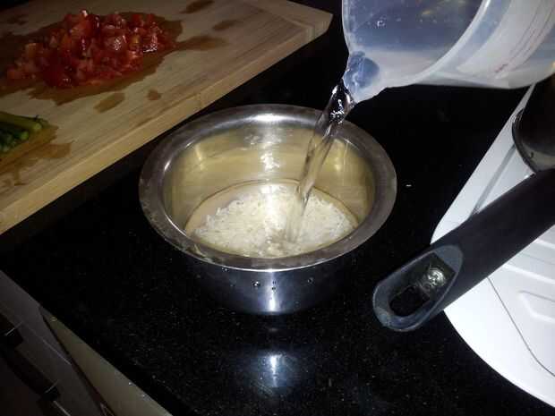 1/4 de taza de arroz de lavado y remojo en 2/3 de taza de agua