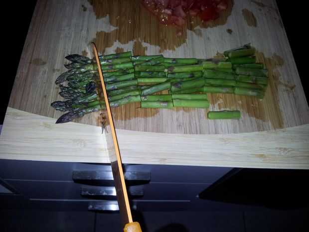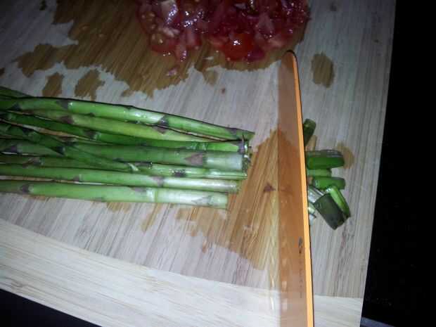 (Usted puede también ajustar o pelar los espárragos si desea :)