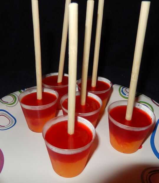 Nota: La primera vez que hice, utilicé tubos de ensayo de plástico que conseguí en un barstore y una parrilla para sostener los tubos verticales. Me olvidaba para los palitos, así que corrió a la tienda y compró agitadores de plástico café. Los estallidos fueron un gran éxito, pero los palillos de plástico tienden a tirar desde el pop, más personas esperaron hasta que el estallido fue parcialmente descongelado y mitad bebió, comieron medio los estallidos.