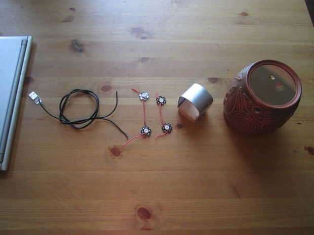 La 2 º foto de este paso en realidad es así mis esquemas de cableado. Tenemos el usb macho va a la laptop, conectada al DC el alambre flexible que luego se conecta los LEDs en paralelo (2 juegos de la serie, en paralelo, se explica), y luego el disipador de calor con LEDs ir dentro de la caja de la lámpara antigua.