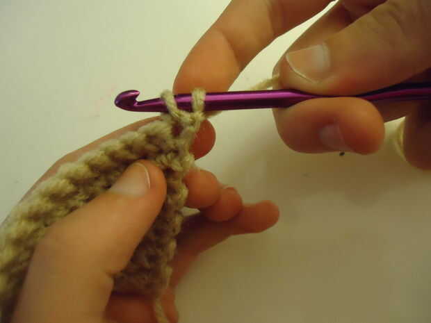 Hemos alcanzado el punto más ancho de nuestra plaza, es hora de reducir nuevamente hasta una esquina. Inserte el gancho en la puntada siguiente envolver hilo y páselo a través de la primera puntada. (2 lazos en gancho)