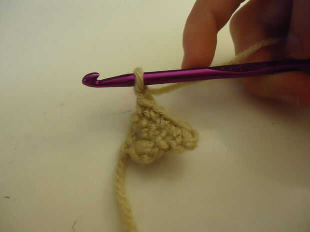 Para la tercera fila: aumento en la primera puntada, solo las tres puntadas de ganchillo, cadena de 1. Ahora debe haber 5 puntadas. El patrón de detección todavía?? Vas a aumentar en la primera puntada y punto bajo en el resto de la fila. Cada vez, debe tener una puntada más que había en la fila anterior.
