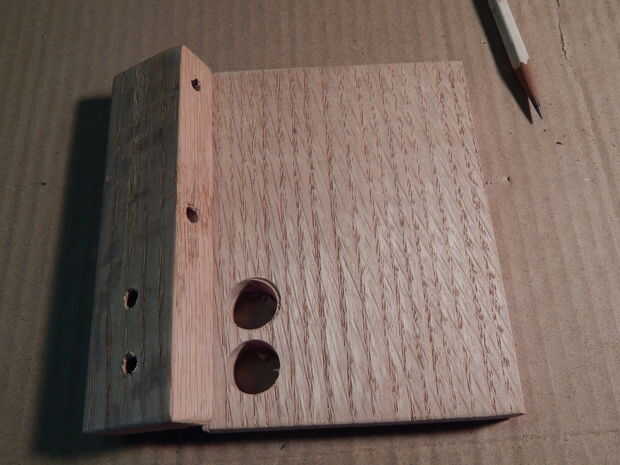 Usé 2 pequeños trozos de roble para la base principal y el cuerpo de este gadget. Ninguna de las mediciones son crítica, planificar hacia fuera de usted mismo. Se perforan dos agujeros para los postes y 2 para los cocodrilos. Éstos son ambos en la parte superior de la base, la parte inferior tiene 2 orificios en la parte posterior de los postes. Hacer algunas ranuras para dejar los cables pasan entre la parte superior e inferior de la base, de la soldadura de 2 alambres (yo usé rojo y verde) uno a cada uno del enlace entradas, después de conjunto las dos partes se pegan (o atornillado podrían ser mejores) juntos.