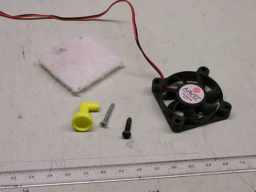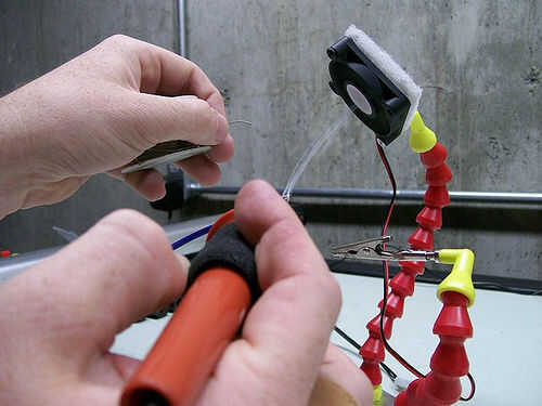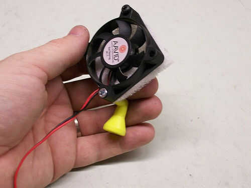 Para el filtro me corte un pedazo de scotch blanco brillante a la forma del ventilador y une un extremo con un tornillo. La esquina opuesta usé un tornillo largo para pasar por el ventilador y filtro en la boquilla. Conectar a una fuente de 12 voltios y la soldadura sin tener humo en la cara.