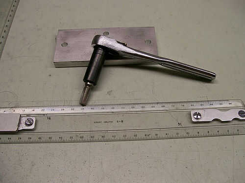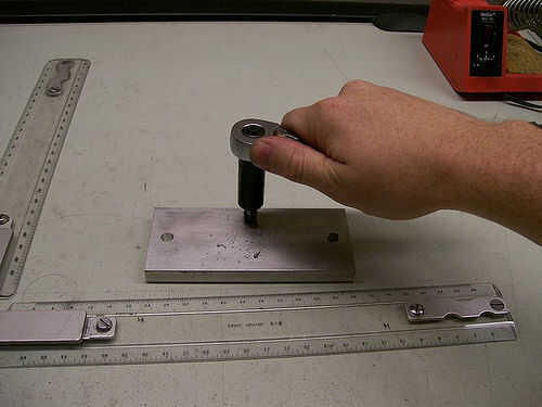 Aprovechar los agujeros para los brazos con el 1/8-27 NPT tap. Recuerde la rosca del tubo es cónico por lo que necesitarás aprovecharlo suficientemente profunda que conector de la manguera tornillos en. Pero golpearlo demasiado profundo hará que se suelta y potencialmente tira de los hilos en el conector de la manguera. También Recuerde que debe mantener el grifo perpendicular a la base.