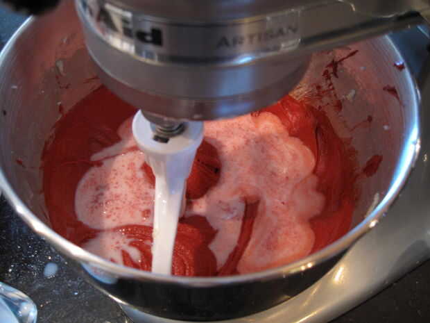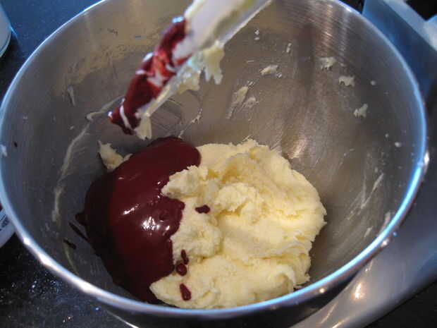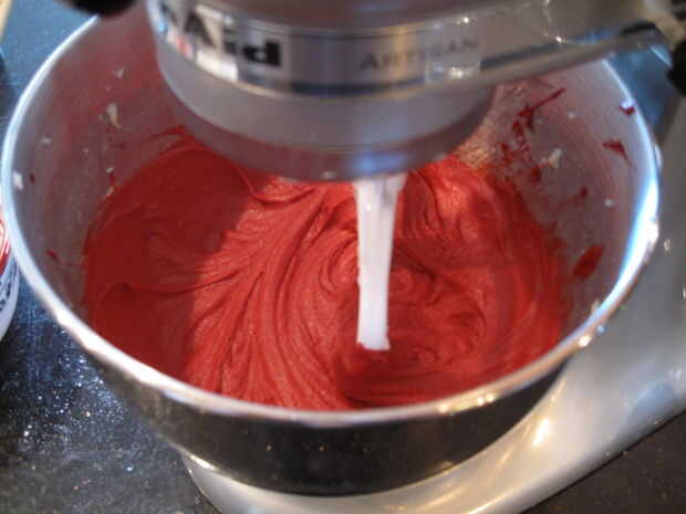 • En un tazón pequeño, bata juntos el colorante de alimento, polvo de cacao y vainilla. Añadir a la mezcla y batir bien.