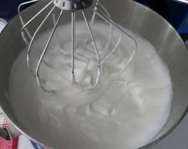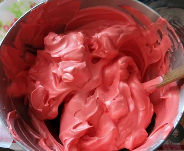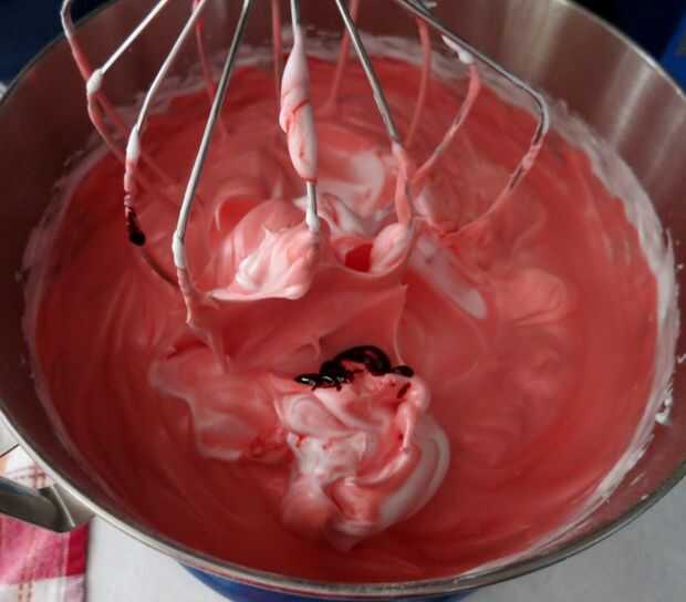 En el recipiente de una batidora de pie bate claras de huevo y crema de tártaro a velocidad baja hasta que acaba roto arriba y espumosa, aproximadamente 1 minuto. Aumentar la velocidad a media-alta y batir las claras a montículos suaves y ondulantes, aproximadamente 1 minuto. Con la batidora a velocidad media, batir en la sal y 3/4 taza de azúcar, 1 cucharada a la vez, hasta que se agrega el azúcar y los blancos son brillantes y picos de forma suave, 1 a 3 minutos. Añadir vainilla y rojo gel alimento pasta y batir hasta que quede apenas mezclado. (Use velocidad media para obtener la pasta de gel mezclada en el color que desee, se verá como un rosa coral, el color se profundizará después de agrega el cacao en polvo)