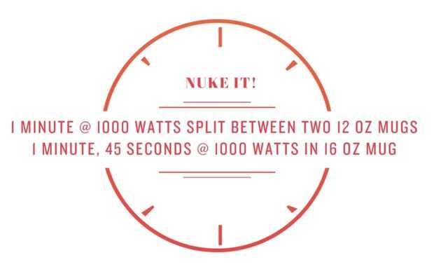 Si desea dividir la masa entre dos tazas de 12 onzas (mi método preferido), cocine durante 1 minuto a 1000 vatios.