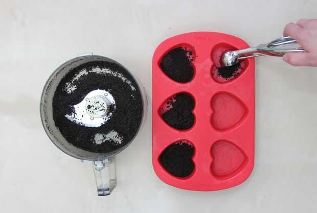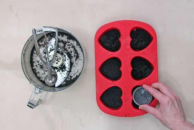 3. usar algo con un fondo plano para presionar la mezcla en los moldes. La pequeña tapa en la tapa de la procesadora de alimentos he trabajado perfectamente! Pero un vaso o una taza de medir pequeña funcionaría así.