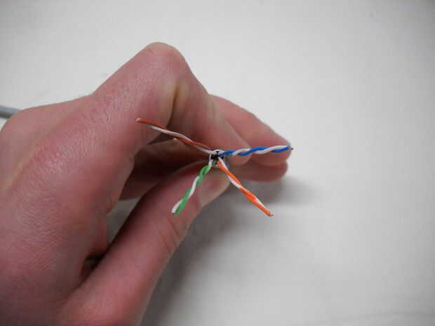 Separe los pares torcidos en un patrón de "x" como se muestra. Cuando usted mira hacia abajo el cable desde el extremo, no debería ver cualquiera de los pares cruzando entre sí. Además, los cables no debe ser en la misma configuración como se ve en la imagen como los cables no están cruzando entre sí.