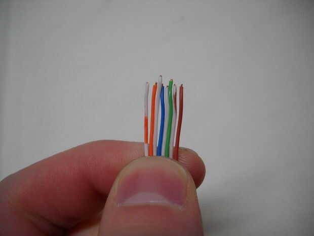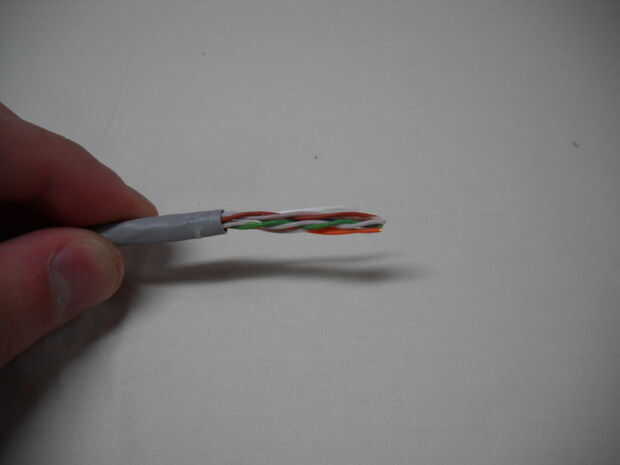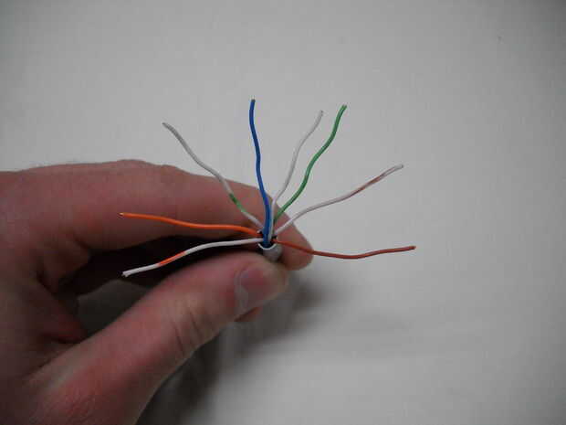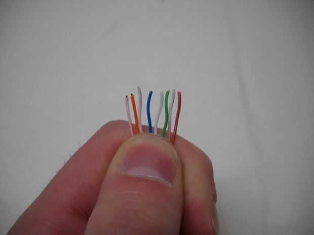 Nota: La configuración de alambre usada arriba es la configuración de T-568B, que es la configuración más común. La configuración de T-568A funciona igual de bien y no afectará la calidad de transmisión del cable. Ambos de estas configuraciones utilizan el diseño de los cables (pares) para aislar los cables entre sí y evitar interferencia y pérdida de datos. Es útil para memorizar cualquier configuración que prefiera. Si usted está interesado en la fabricación de un cable cruzado de Ethernet, simplemente hacer una búsqueda de imágenes para "Ethernet Crossover Cable diagrama" obtener un diagrama de configuración de cable.