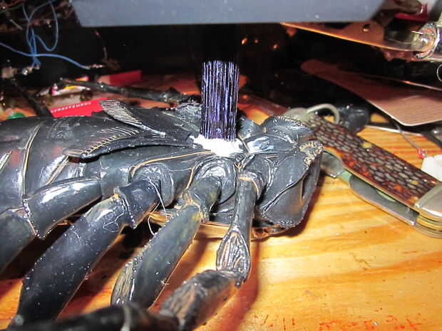 OK: he añadido algunas fotos del interruptor, lo que los interiores parecen cuando enciende, y los resultados de la capa reactiva UV coloqué sobre los interiores (sí, sé las "afueras" de scorpians resplandor bajo lámparas de UV, pero este tiene una cáscara superior clara para que pueda ver sus entrañas, así que les hice brillar... la lámpara he añadido un solo LED de UV muy brillante.