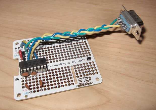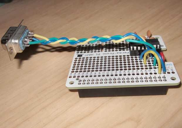 Robaban en mi cajas de los desperdicios para un puerto serial DB9 estándar. Soldado un cable verde al pin 5, un cable azul a la clavija 3 y un cable amarillo con conector de 2. Había soldado el cable verde hacia el carril de tierra en el sombrero. Había soldado el cable azul al pin T1OUT transceptor. Había soldado el cable amarillo al pin R1IN transceptor.