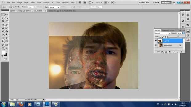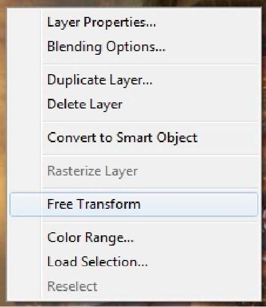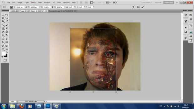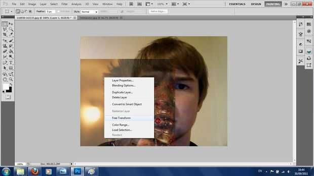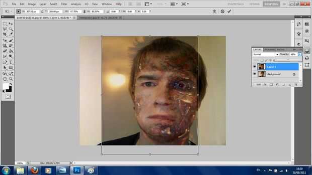 Una vez que estés cómodo con la opacidad que debe haga clic en la imagen de terminator y seleccione transformación libre del menú. Esto crea cajas pequeñas en las esquinas de la imagen que le permite arrastrar y cambiar la forma de la imagen como mejor parezca. Para mover la imagen simplemente haga clic y arrastre en posición. Remodelación se hace clic y arrastra las cajas de la esquina.