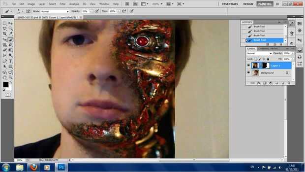 No creo que es posible conseguirlo bang a derecha utilizando sólo la herramienta de degradado (si consigues hacerlo entonces bien!!!!!!) así que la próxima cosa a hacer es tocarlo usando el pincel. Cuando se selecciona la máscara vectorial y utiliza blanco, pintará en la cara de terminator, cuando usas negro que acabará desapareciendo la cara de terminator y revelando su propia. así que tal vez se pregunte a sí mismo "MMM, me pregunto ¿qué pasaría si pinta de gris?". Bien esa es una pregunta fantástica! la respuesta es que te pintas en una sección parcialmente transparente de la cara de terminator y esto es muy importante para nivelar las dos imágenes juntas y crear ese efecto transparente.