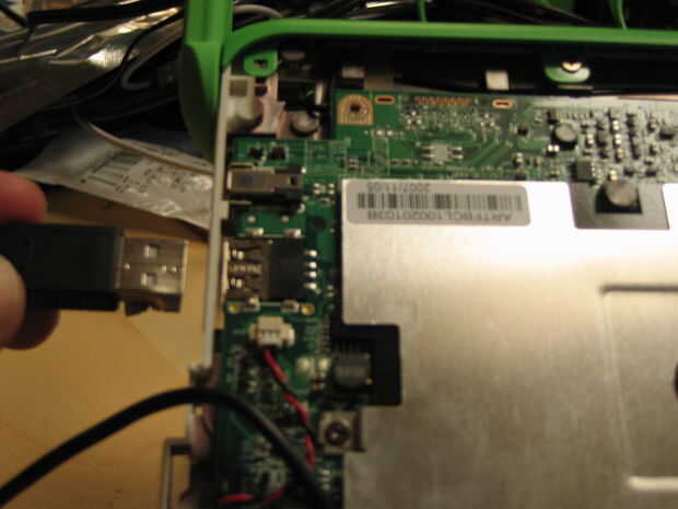 Una vez que baje la tapa trasera, sin embargo, verás que los frikis en OLPC deben han querido que hackear tu XO esta manera; ¿uno de los puertos USB no es como los otros, en lugar de ser montado perpendicular a la placa base, es plano a lo largo, lo que significa que los pines son visibles y prácticamente gritando hacia fuera para ser soldadas a algo: un hub? ¿un modem 3G? Tal vez mi próximo proyecto debería ser un acuario interno del USB...
