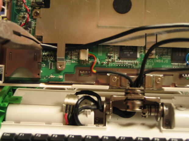 Ahora, tomar la parte del cable del teclado que todavía está conectado al teclado (y por extensión, el XO) y con cuidado colócala en el lado de la bisagra. Tire del cable de todo el camino, entonces lo alimentan para arriba por la parte superior de la bisagra en la cabeza de tu XO. Si el cable se atasca, alicates ayudará realmente. No te preocupes de dañar el final del cable; vamos a cortar mucho de que.