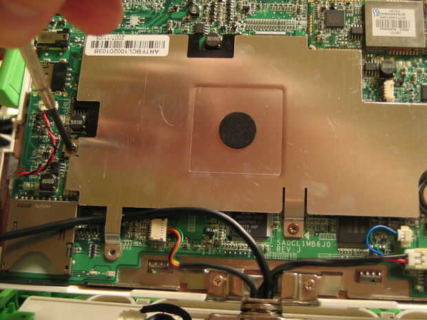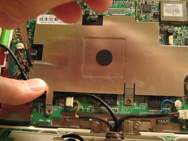Hay un buen protector de calor cubriendo la mayor parte de la placa base que proporciona un gran lugar para pasar el cable del teclado. Sólo cóloque el cordón a lo largo de la parte inferior de la pantalla térmica, tire a través del apoyo en el borde izquierdo. Para hacer la vuelta de la esquina, tuve que desenroscar una de las ayudas de protección contra el calor (como se muestra en la tercera foto).