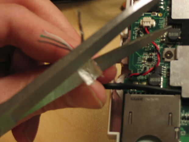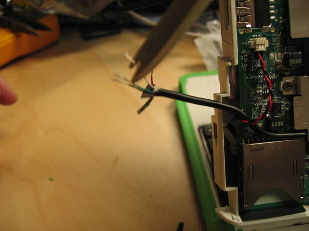 Tal como hicimos con el Stumpy, vamos a Retire el cable, pero esta vez vamos a tener que recortar cosas cuidadosamente para obtener los cables en los pines del puerto USB. Tuerza el alambre desnudo, sin aislamiento en un paquete y corte el blindar de la hoja con un par de tijeras, pero no tira de los cables de colores todavía.