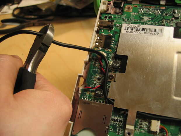 Tira, torsión y corte de alambre a la longitud adecuada para llegar a su pasador, pero asegúrese de que hacerlo lejos de la placa base. Si cualquiera de esos filamentos se mete en su sistema, podría causar un cortocircuito desagradable y que podría ser el fin de tu XO. Los cables de diferentes longitudes, al igual que los dedos--wow, esta analogía es realmente buena. Dar cada alambre otra vuelta de tuerca después de cortar para asegurarse de que no hay cualquier hebra perdida que podría tocar otros pernos, la placa base, la cubierta del puerto USB, etc..