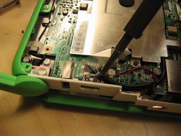 Aquí es donde entra nuestra pieza de cinta de celofán; pone la "mano" en posición, luego la cinta los dedos hacia abajo. Todos "dedos" deben estar en su lugar, tocando su respectivo perno de la placa base, con el pulgar mintiendo sobre la cubierta del metal de puerto USB (donde vas a lo de la soldadura). Asegurarse de que no hay ningún exceso de cable en cualquier lugar que podría caer sobre el borde y tocar la placa base.
