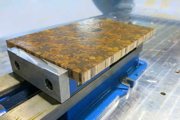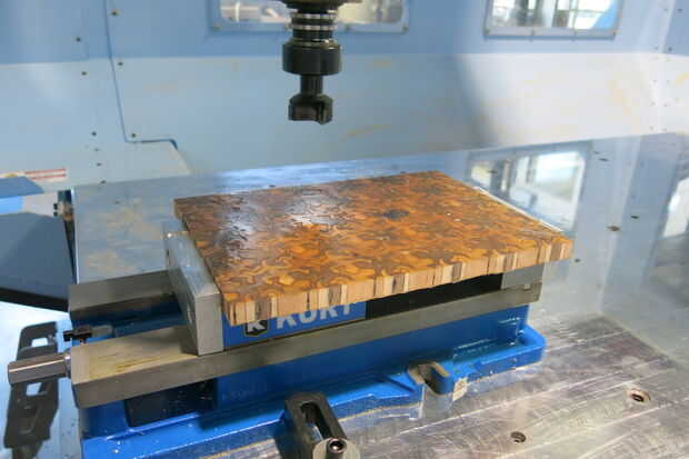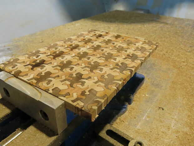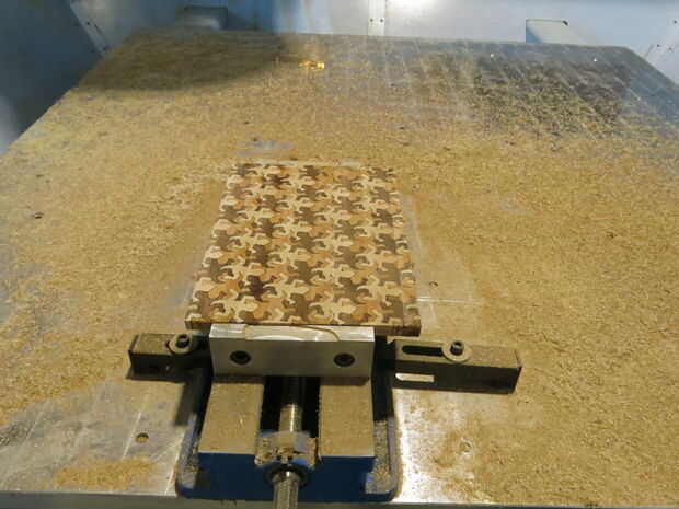 Es como cortar el césped con una máquina increíblemente precisa. Podría haber sido exagerada, pero no pude encontrar una forma más sencilla. Se podría utilizar un Shopbot, o incluso un molino de Bridgeport. La parte más delicada era montar un vicio con parallels para mantener la madera donde yo quería.