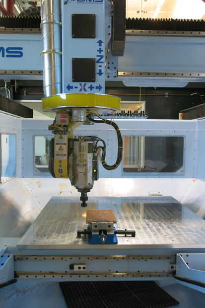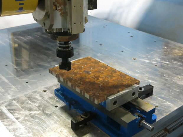 Tenemos acceso a un router de 5 ejes DMS en el muelle 9, y había tomado la clase ese día, así que ¿por qué no alguna práctica en él? Usé una broca fresa para llevar a cabo una operación de revestimiento manualmente. Podía haber programado algo, pero era mucho más simple utilizar el control manual en los ejes X e Y para realizar el revestimiento.