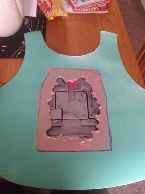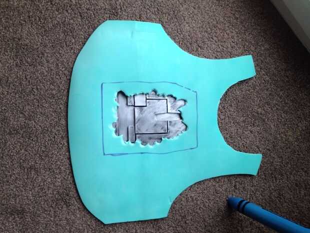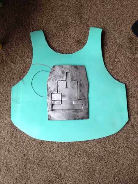En gran medida mi parte favorita de este instructable fue la carne!! En primer lugar utilicé un chaleco como plantilla para cortar algunos espuma eva en forma de pecho. A continuación pongo el pecho de metal en la parte superior donde pensé que parecía bueno y dibuja una línea alrededor de él para una plantilla. Para crear el aspecto de carne me corte un bruto agujero en la espuma y empecé 'pellizcos' la espuma para crear un aspecto de la carne quemada.