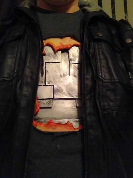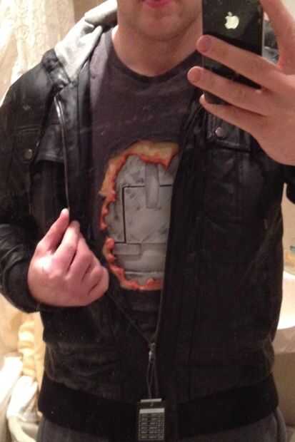 Finalmente conseguir una camiseta usada y cortarlo hasta pegamento entonces la pechera a la camiseta. Para un extra opcional usar sangre falsa alrededor de la carne.