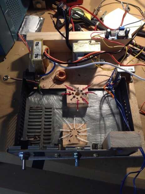 Para este amplificador de tubo, estoy utilizando la técnica de la protoboard. En primer lugar, tomar una losa de madera y colocar una caja metálica en la la madera. Entonces, pienso a dónde voy para empernar abajo todos los transformadores de suministro de energía. Después de eso, añadir una placa posterior al extremo del chasis. En medio de la cubierta del metal, adhiera un pedazo de tablero revestido de cobre y tierra a la parte metálica del chasis. El chasis debe hacerse ahora.