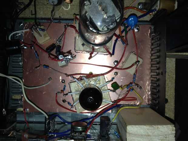 Para cablear el circuito de audio, sobre todo tienes que sólo tienes que seguir el esquema del circuito. Siguen las líneas en el diagrama y conecte los diferentes muestran componentes juntos a modo de las líneas en el diagrama. Conecte todas las conexiones a tierra para el cobre revestido de placa en la parte inferior y aislar las conexiones y empalmes desde el suelo con clavos martilló en pequeños cubos de madera de la soldadura. Cuando realice el cableado, preste especial atención a la clasificación de la tensión y potencia de los condensadores y resistencias. Asegúrese de que todas las uniones de soldadura son seguras y asegúrese de que todos los componentes necesarios han sido utilizados. Como el diagrama del circuito es seguido de cerca, debe trabajar este amplificador de tubo.