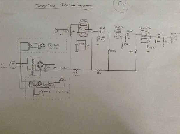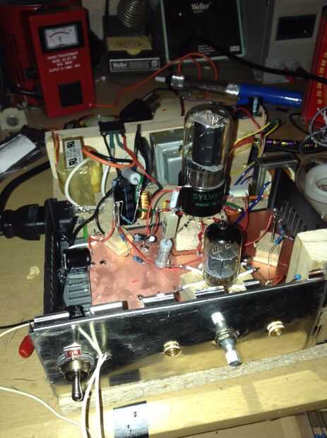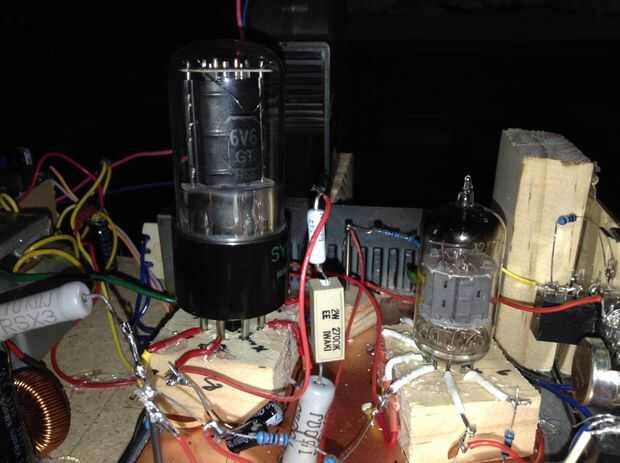 Este amplificador a válvulas usa tubo 12AX7 triodo dual primero amplificar la tensión de pequeña señal de audio. El voltaje entonces sale el tubo a través de un condensador interetapa en el 6V6 tubo que conduce el transformador de audio.