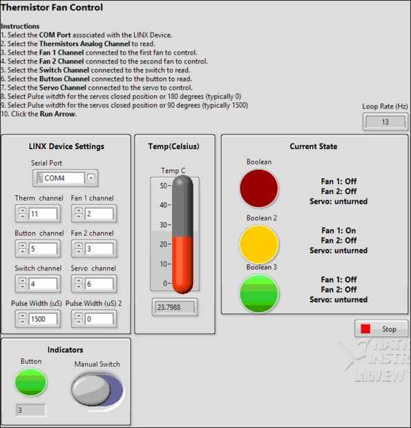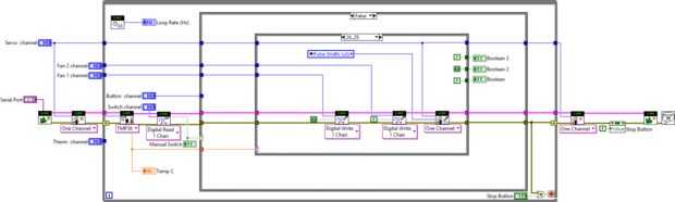 Mi código de LabVIEW puede descargar haciendo clic en el archivo "fan_control.vi" a continuación. Si has seguido mis instrucciones anteriores, entonces los valores por defecto del canal ya se fijan pero si usted utiliza diferentes canales tienes que cambiarlos. También, si usted está usando un servo diferentes, tienes que jugar con los valores de ancho de pulso de ambas posiciones. De lo contrario, sólo siga las instrucciones en el panel frontal y no dude en comentar cualquier pregunta que tenga.