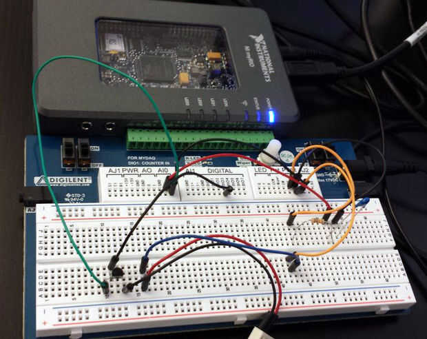 En primer lugar, organizar el termistor en serie con una resistencia de 10kΩ y suministro con 5V. Alimentar el voltaje en el termistor en el conector C - canal AI0 situado en el lado derecho de la myRIO MSP.