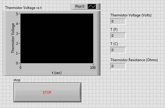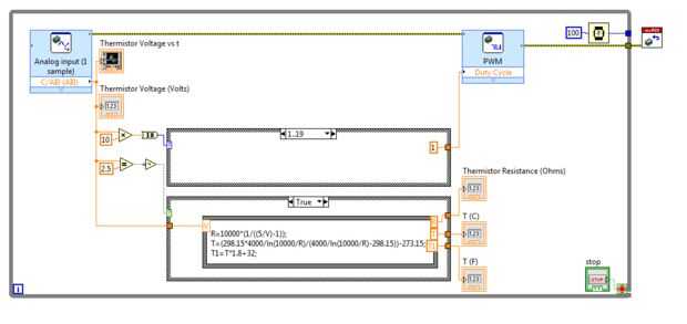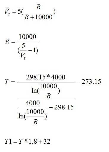 Para las ecuaciones en la foto superior, Vt = voltaje en el termistor, R = resistencia del termistor, T = temperatura del termistor en grados Celsius y T1 = termistor temperatura en Fahrenheit. VT se encuentra utilizando una ecuación de divisor de tensión y R se encuentra por reordenar esta ecuación. Utilizando R, la temperatura puede entonces ser calculada. Nota - en el Celsius cálculo, se calcula la temperatura en Kelvin y luego se resta 273.15 para dar la lectura correcta. Además, el valor 4000 utilizado es el valor de beta el termistor que se encuentran en la hoja de datos. Estas ecuaciones se utilizan en el fórmula bloque en el diagrama de bloques.
