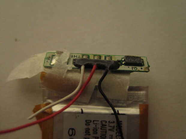 Lo que queremos es pequeño pcb donde van los cables en. Mina fue grabado en con cinta kapon y envuelto en cinta adhesiva. Fue unido a la batería con dos lengüetas que cortadores de alambre hizo brevemente el trabajo de. Se podría soldar estas así, pero no va a utilizar estas conexiones por lo que no tiene ningún sentido. Toma del PWB y la lipo de la célula según normativa local (estos son considerados residuos peligrosos y se debe a una caída de batería apagado).