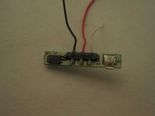 usé un medidor múltiple para comprobar que el termistor se conecta entre el cable blanco (themistor hacia fuera) (todas las pilas que he visto utilizan los códigos de color) y negro (gnd). De todas formas Asegúrese de que el es una impedancia entre los cables blanco y negro. Mina fue 10k a la temperatura ambiente. Puede cortar el cable rojo cuando no lo necesitamos ya. Que trata es el termistor.