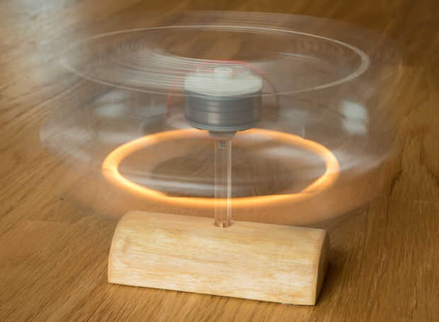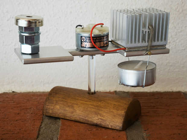 El corazón de la construcción, el módulo termoeléctrico, también se llama un elemento peltier y cuando se utiliza como generador se llama efecto seebeck. Cuenta con una caliente lateral y uno frío. El módulo genera energía para conducir un motor cuyo eje está conectado a la base. Todo girará y el flujo de aire enfriará más rápido que la placa de aluminio abajo el disipador de calor superior. Mayor diferencia de temperatura = > aumento de potencia de salida = > mayor motor RPM = > aumento del flujo de aire = > mayor diferencia de temperatura, pero disminuyó la energía de la vela. La vela también sigue la rotación el calor será menos eficiente, con mayor velocidad y esto equilibrará las RPM para una buena rotación lenta. No puede ir demasiado rápido para apagar el fuego sí mismo y no puede parar hasta que la vela se queda sin combustible.