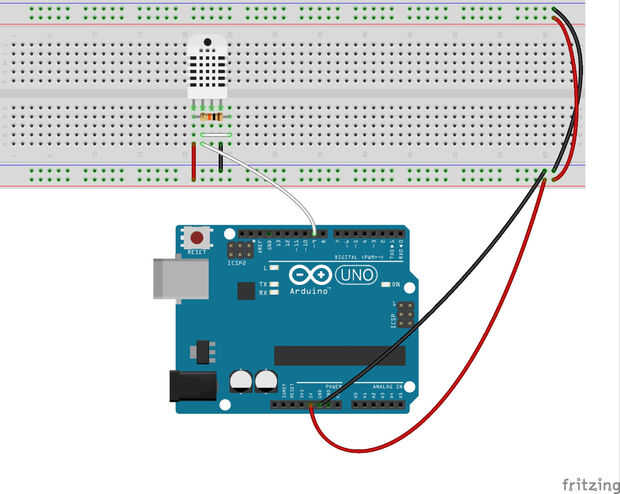 Consejo: Si usted quiere reconocer rápidamente la función de un cable, use un estándar de colores. Rojo y negro deben ser respectivamente asociados a Vcc y GND. Utilizamos un cable blanco de Dupont para el pin de datos de la DHT22.