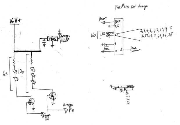 En el circuito, el Atmega lee la temperatura del sensor. Después de él decide como cambiar los segmentos para crear los números vistos. En esencia el resto de la Junta de circuito proporciona 5V para el Atmega, un banco de MOSFETs para permitir que el Atmega a los LEDs de alta corriente.