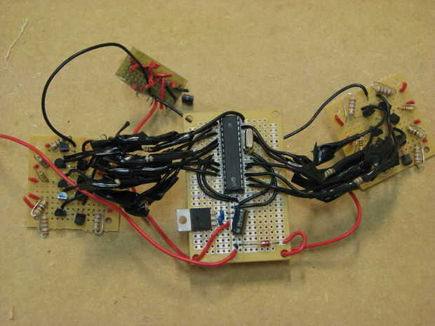 Importante, otro problema que tuve con el circuito fue el hecho de que tenía dos rieles de voltaje. Que funciona bien excepto después de una larga noche de soldadura me olvidé. Cuento largo tuve que reemplazar el sensor y el microcontoller ya alambré para el rail de 16V. (Creo que el voltaje máximo para ambos es de 6V, así que un poco más :)) Ni que decir tiene no fue difícil de diagnosticar el problema cuando tocaba el micro controlador y estaba ardiendo caliente.